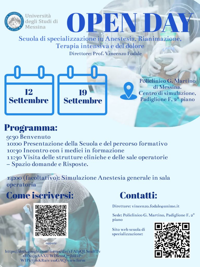 PARTECIPA ALL’OPEN DAY 2025 DELLA SCUOLA DI SPECIALIZZAZIONE  IN ANESTESIA DEL’UNIVERSITA’ DI MESSINA – VENERDI 12 e VENERDI  19 SETTEMBRE 2025 ORE 9:30 – POLICLINICO DI MESSINA – Via Consolare Valeria 1 – 98125 Messina