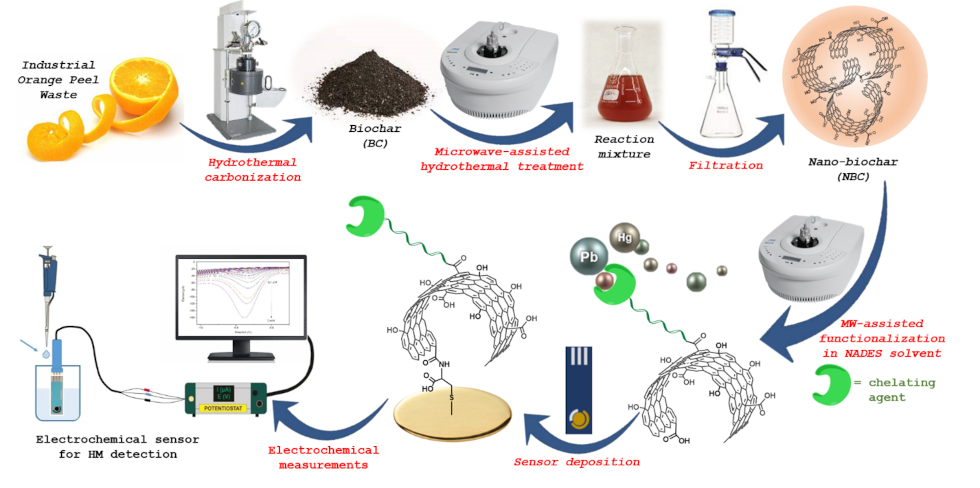 Il materiale sensibile proposto per il rilevamento degli HM deriverà da scarti agricoli e, in particolare, dalle bucce d’arancia (OP) come fonte rinnovabile per la sintesi di nanomateriali a base di carbonio con struttura grafenica. Questo nuovo nanomateriale ecologico sarà sintetizzato dall’OP mediante carbonizzazione idrotermale (HTC) che consente la grafitizzazione della matrice di carbonio. Il biochar (BC) così sintetizzato sarà sottoposto a trattamento idrotermale assistito da microonde per ottenere, il materiale di dimensioni nanometriche nanobiochar (NBC). La capacità chelante degli HM sarà ottenuta attraverso strategie di modificazione superficiale degli NBC con arginina, cisteina, tirosina, istidina (AA) mediante classica reazione di accoppiamento tra le funzionalità carbossiliche esposte sulla superficie dei nanomateriali e le funzionalità nucleofile presenti sugli AA. Queste reazioni verranno condotte in un sistema a microonde utilizzando una serie di solventi eutettici profondi naturali (NADES) in condizioni rispettose dell’ambiente. Lo sviluppo di sensori selettivi per metalli pesanti a basso costo si inserirà in un contesto di innovazione tecnologica, poiché tali sensori potrebbero essere integrati in sistemi di monitoraggio ambientale in tempo reale controllati da remoto, con monitoraggio costante delle acque domestiche, industriali e agroalimentari, apportando benefici in termini di qualità della vita e dell’ambiente.
