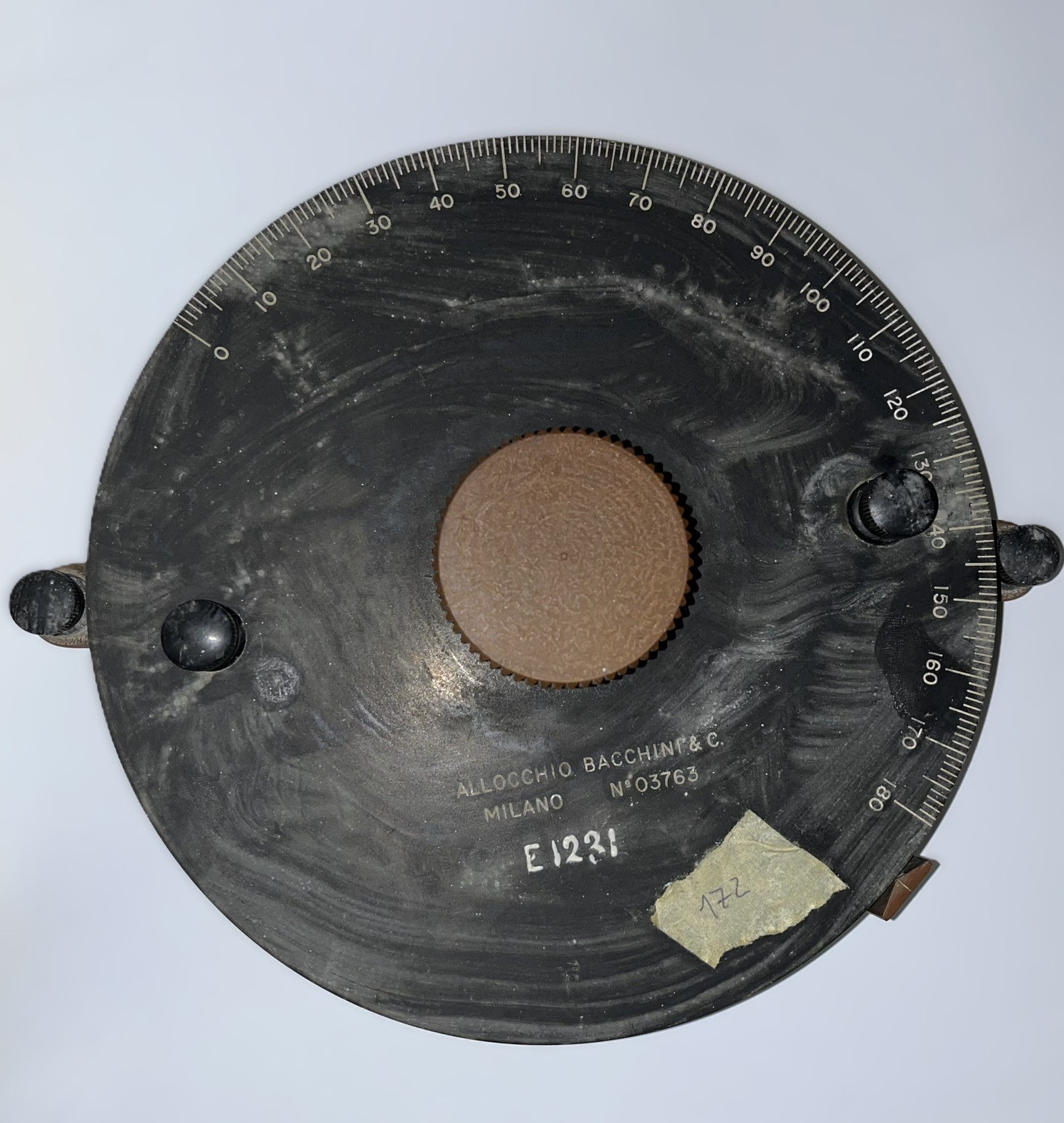 Description: This device, calibrated in degrees, is likely used in experiments to measure precise angles, especially in optics or mechanics. It features a circular scale with fine gradations and adjustable components.