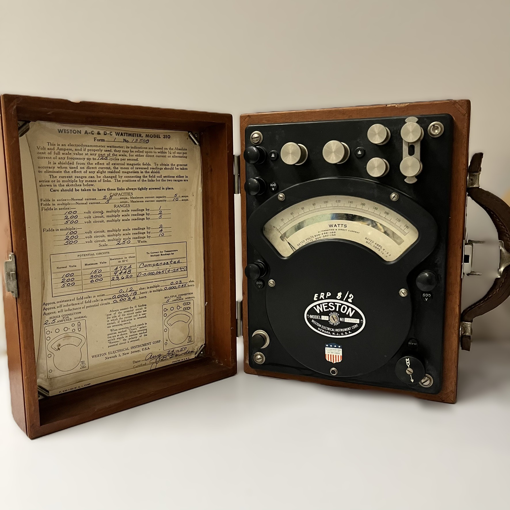 Description: A precision instrument for measuring electrical power in AC or DC circuits. It includes detailed calibration scales and is enclosed in a protective case, reflecting its use in detailed electrical experiments.
