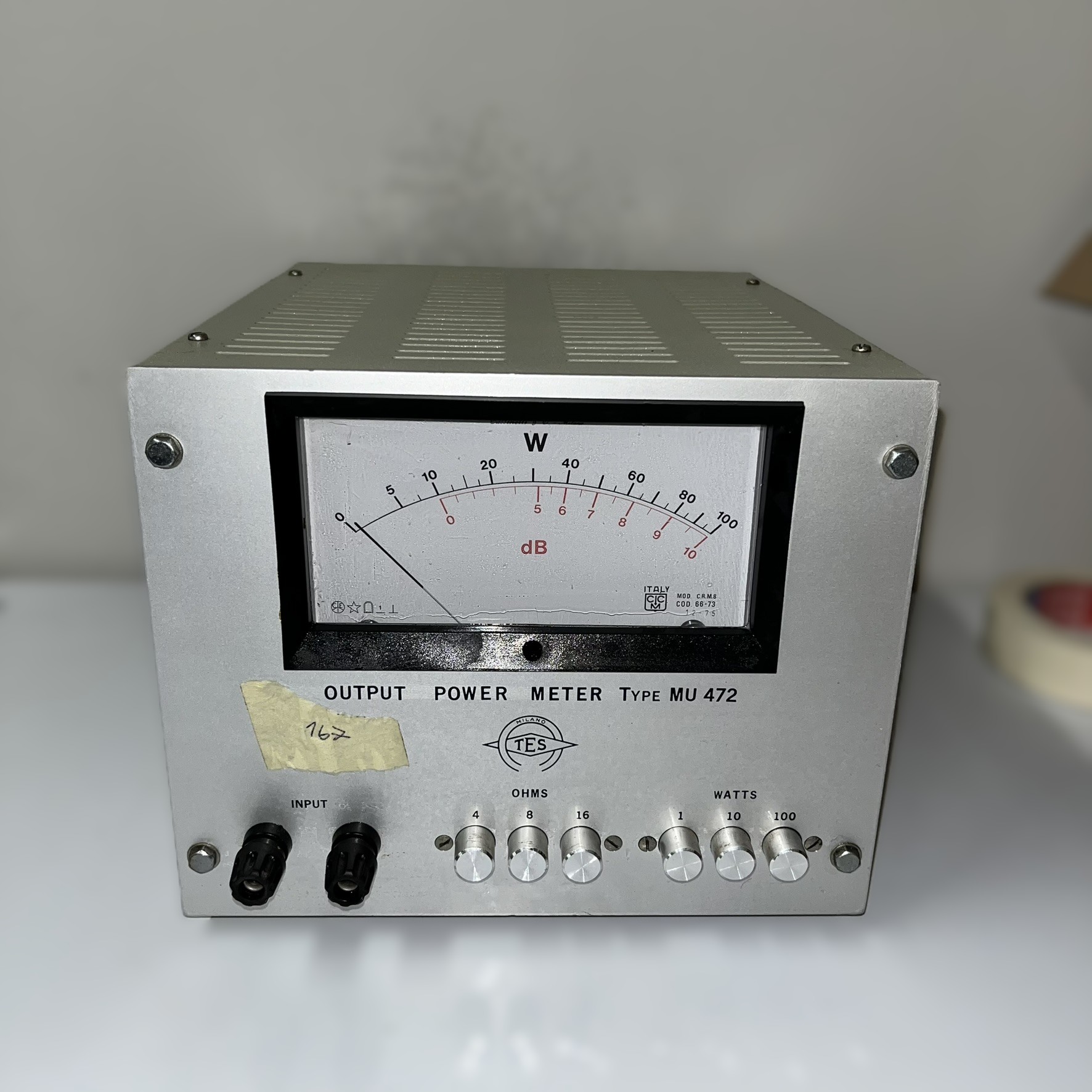 Description: This device, identified as a power meter (Type MU 472), is used to measure the electrical output power in watts or decibels (dB). It features multiple input and adjustment settings, making it suitable for precision measurements in electronic and electrical experiments.