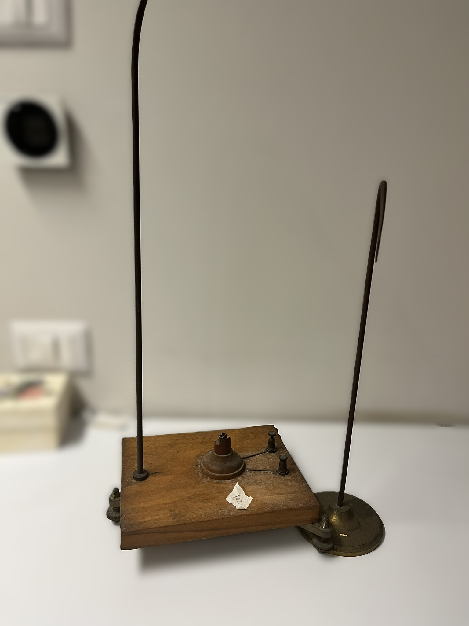 Description: This apparatus is used to study the behavior of charged bodies and electrostatic forces. The pendulum demonstrates the interaction between a charged object and surrounding electric fields, often used in electrostatics demonstrations