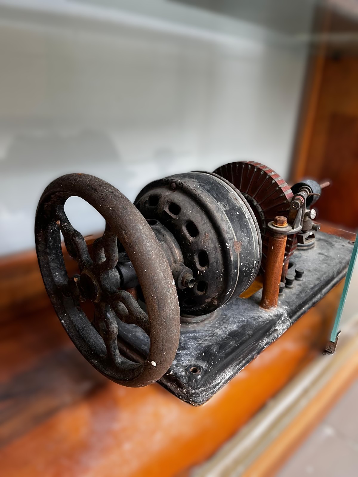 Description: This is a hand-cranked dynamo, an early electrical generator that converts mechanical energy into electrical energy. It was commonly used in educational demonstrations to illustrate the principles of electromagnetic induction and electricity generation.