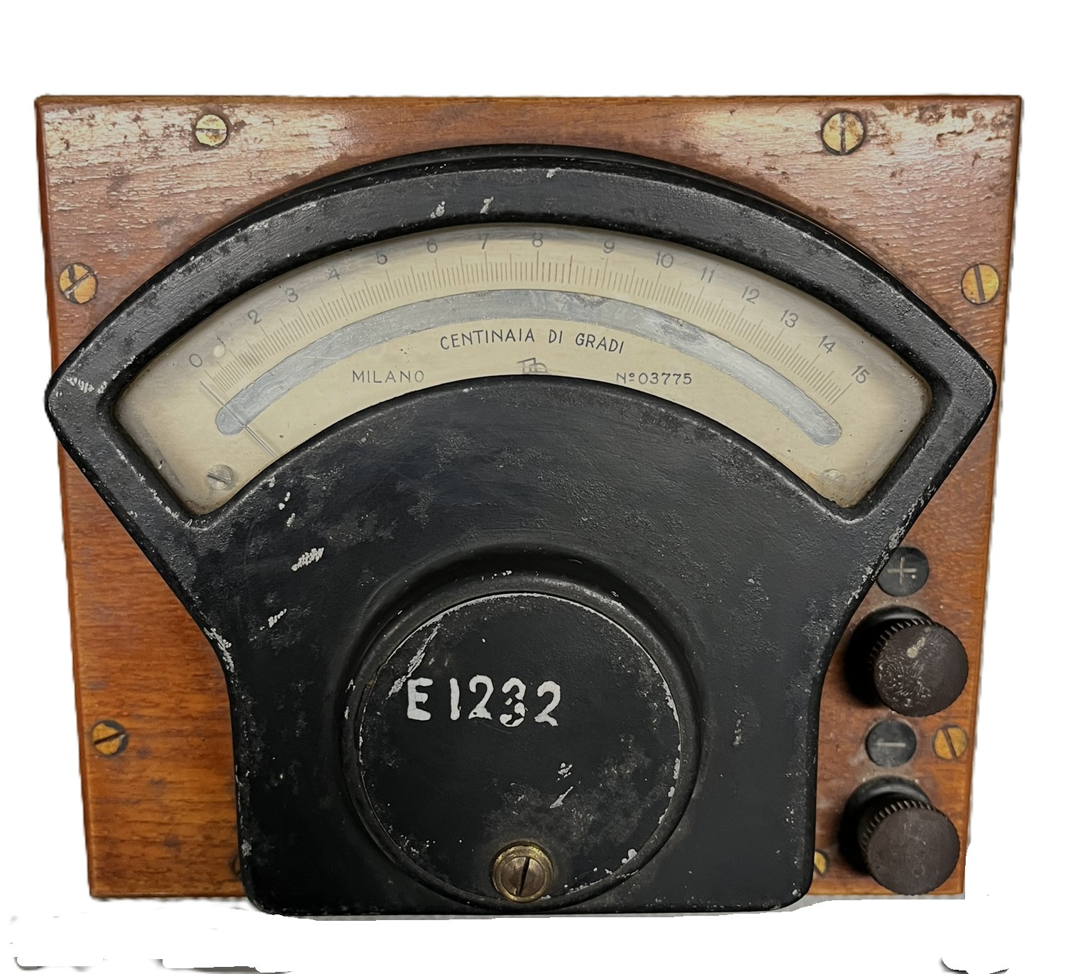 Uno strumento per misurare la corrente elettrica più sensibile di un amperometro. Questo particolare esemplare utilizza una scala in gradi. Ciò è probabilmente dovuto ad un differente linguaggio utilizzato all'inizio del XX secolo.