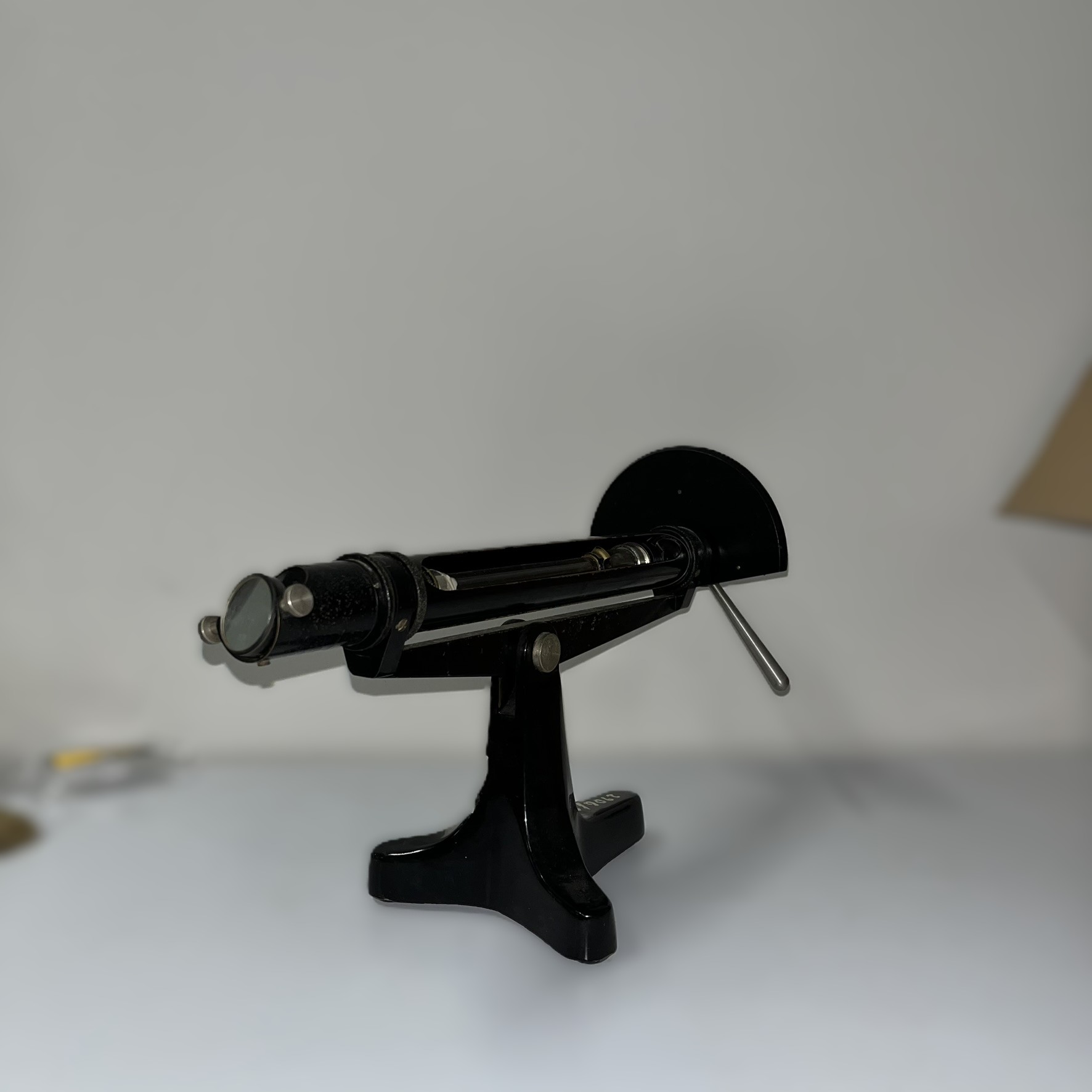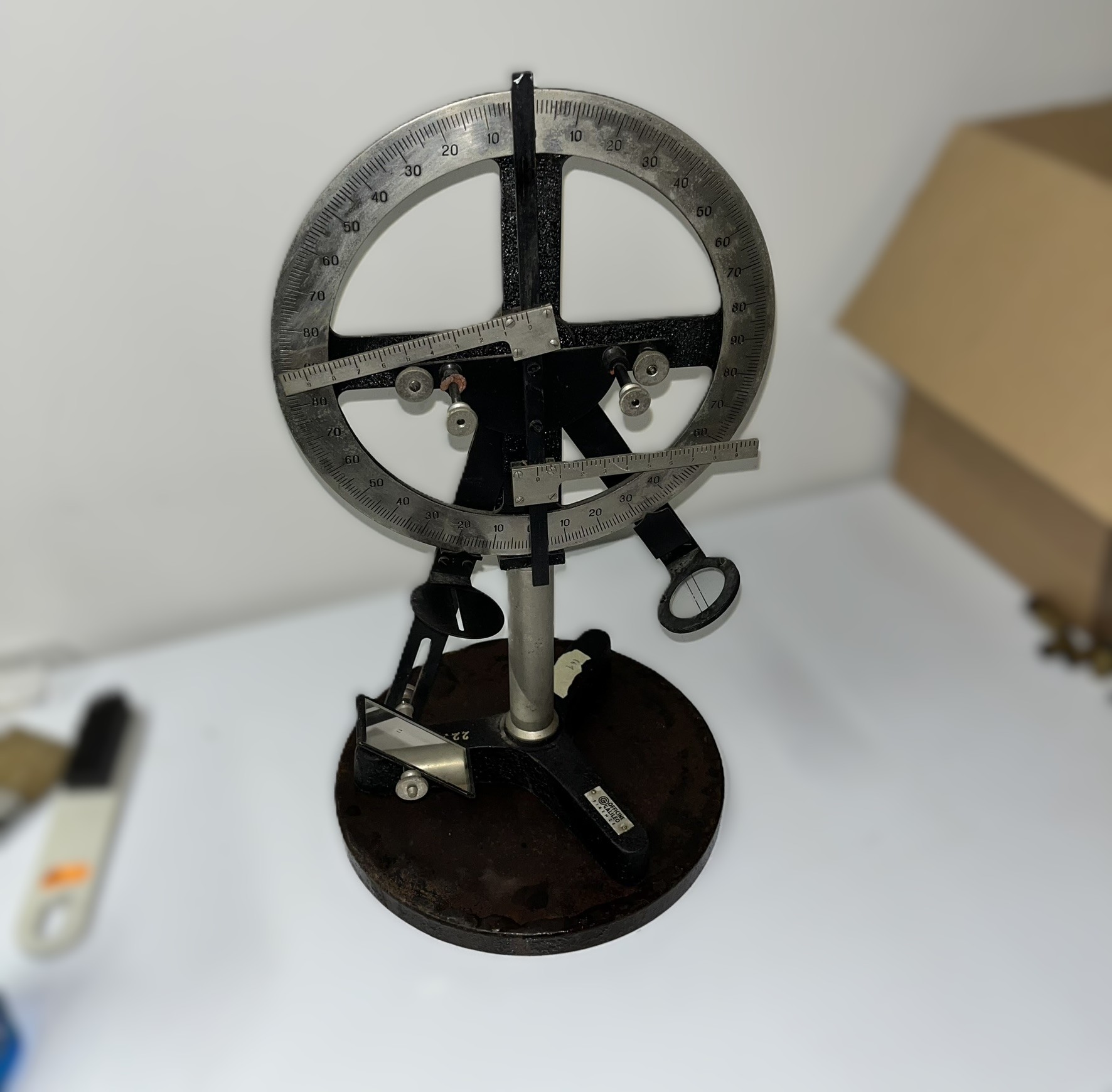 Description: A goniometer is used to measure angles, specifically the angles between crystal faces or the angles of light reflection/refraction in optical experiments. This instrument is widely used in crystallography and physics to study the geometric properties of crystals or to analyze light behavior when passing through various media. It typically consists of a circular scale, adjustable arms, and a magnifying lens for precision measurement.