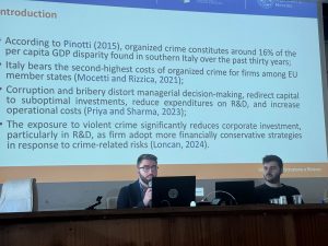 On May 19th, 2025, Dott. Marco Spadaro presented the paper “The Silent Stranglehold: Quantifying Organized Crime’s Chilling Effect on Firm Efficiency and R&D”, co-authored with Professor Antonio Fabio Forgione and Professor Carlo Migliardo, during the workshop Migration, migrants, and women: between work, consumption and invisible barriers, held at the Department of Economics of the University of Messina.